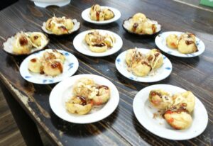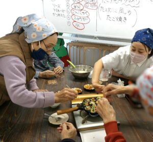 テーブルごとに分かれ、生地を流す方、具を入れる方、くるくると返す方と役割を分担しながら、協力してたこ焼きを作りました。「いい色になってきたよ~」「そろそろ返そか!」と声をかけ合い、男性の方々もとても積極的で、手際よく返してくださる姿がとても印象的でした🤗