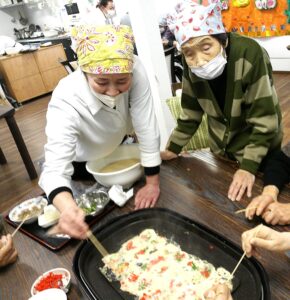 テーブルごとに分かれ、生地を流す方、具を入れる方、くるくると返す方と役割を分担しながら、協力してたこ焼きを作りました。「いい色になってきたよ~」「そろそろ返そか!」と声をかけ合い、男性の方々もとても積極的で、手際よく返してくださる姿がとても印象的でした🤗