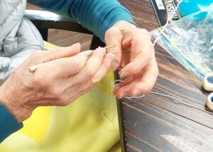 たくさんいただいた毛糸を使い、一本一本を丁寧に編んでくださる姿がとても印象的です😊 「商売繫盛してるよ~」と明るく笑いながら、手を動かすそのご様子に、まわりも自然と笑顔に包まれていました🎵 思わず、その素敵な手元をパシャリと一枚📷✨