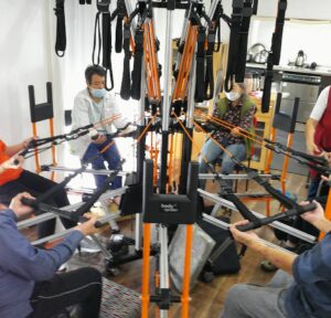 道具を使った体操では、ゆっくり伸ばしたり、バランスをとったり。「むりなく動けるのがいいね」と笑顔も見られます😀